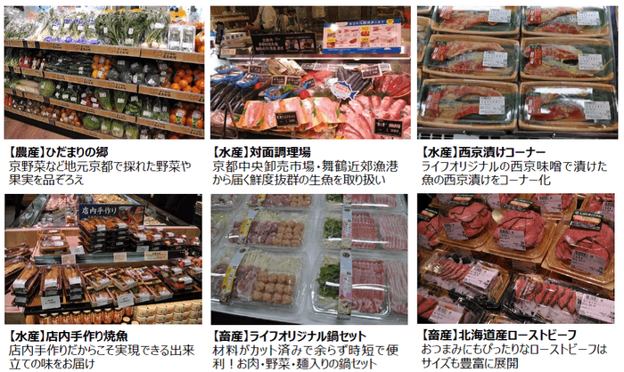 鮮度抜群の生鮮食品やおいしさを追求したお惣菜・手作りパンを品ぞろえいたします。また、地元にお住まいの方にも遠方からお越しの方にもお楽しみいただけるよう、京野菜・漬物・地酒など“京都自慢のおいしさ”を取りそろえいたします。