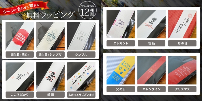 誕生日やクリスマスなど、さまざまなイベントに合わせてお選びいただける12種類のラッピングデザインをご用意しました。