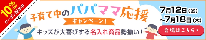 7月12日から先着100注文に、対象のこどもグッズを通常価格より10%オフになるクーポンを配布いたします。この機会に、ご自宅用はもちろん、ギフト用としてもぴったりな各種こどもグッズをお求めください。