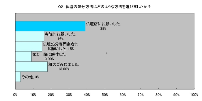 仏壇の処分方法について尋ねてみたところ、「仏壇店にお願いした」(39%)が一番多く、「粗大ごみに出した」(18%)と続き、「寺院にお願いした」(16%)「仏壇処分専門業者にお願いした」(15%)、「家と一緒に解体した」(9%)「その他」(3%)という結果となりました。