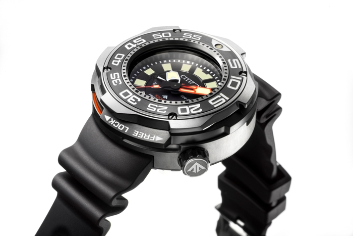 「エコ・ドライブ プロフェッショナルダイバー1000m」はISO/JIS規格に適合し、飽和潜水にも対応。ケースの10時位置にヘリウムガス排気バルブを設けており、飽和潜水時に時計内部に侵入したヘリウムガスを排出する事により減圧時の時計の破損や損傷を防ぐ事ができます。また、光発電エコ・ドライブを搭載しているため、定期的な電池交換が不要。充電量表示機能※2により事前に充電量を把握することができ、時計が急に止まる心配をする事なくダイビングに臨むことができます。