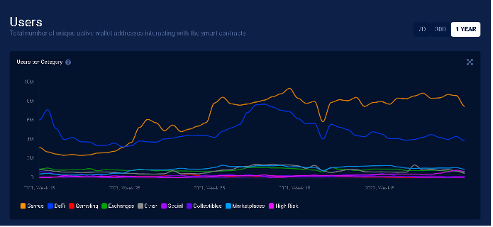 また、DapperRadarのデータによりますと、ブロックチェーンゲームのアクティブユーザー数は、仮想通貨全体の50%以上を占めており、4月におけるブロックチェーンゲームユーザーのアドレス数はすでに132万を超えています(3月:122万)。従って、ブロックチェーンゲームのブームは依然として続いていると言っても過言ではありません。