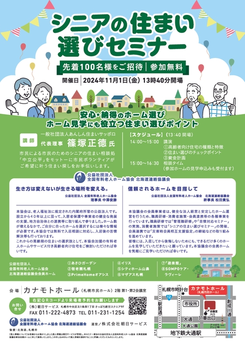 公益社団法人全国有料老人ホーム協会 北海道連絡協議会が、2024年11月1日(金)に「シニアの住まい選びセミナー」(会場:カナモトホール、後援:北海道、札幌市)を開催いたします。