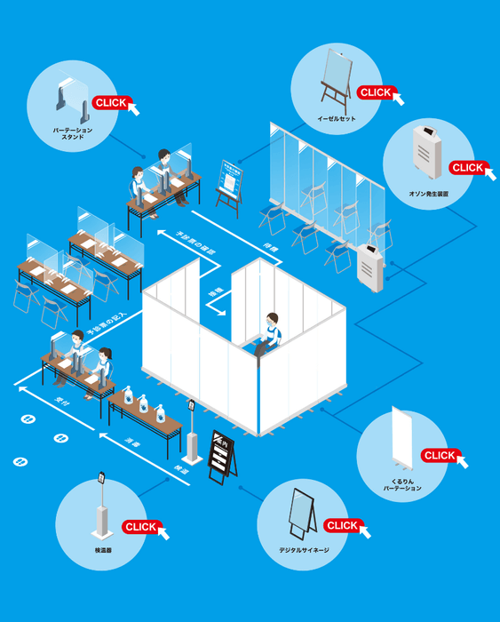 本サービスでは、当社の担当者が過去の設置事例に基づき、接種者導線(検温→受付→問診→接種→接種後待機場所)でのサイン設置、接種室、運営・医療関係者控室の設営、会場内の感染対策として飛沫パーテーションやオゾン発生器など適切な場所への設置、予診票の印刷、運営マニュアルの作成などトータルでプランニングし会場づくりをサポートします。また、運営誘導・清掃スタッフ手配などの要望にも対応します。