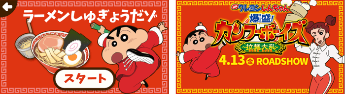 この度、最新作「映画クレヨンしんちゃん 爆盛!カンフーボーイズ ~拉麺大乱~」の公開にあわせて、ラーメン作りを再現したお手伝いコンテンツ「ラーメンしゅぎょうだゾ」を新規投入いたしました。好評だった前作をさらに上回る前評判で注目を集めている今作の映画では、「ラーメン」が物語の鍵を握っており、本コンテンツにおいてもしんのすけがラーメン店の店員として、お客さんのオーダー通りにラーメンを作って提供するという、映画の世界観と関連した内容になっています。