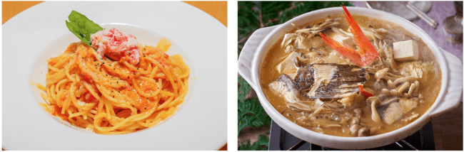 左:女性やお子様が大好きなパスタは、ソースに深みと旨味を加える渡り蟹を使ったトマトクリームパスタでご提供。