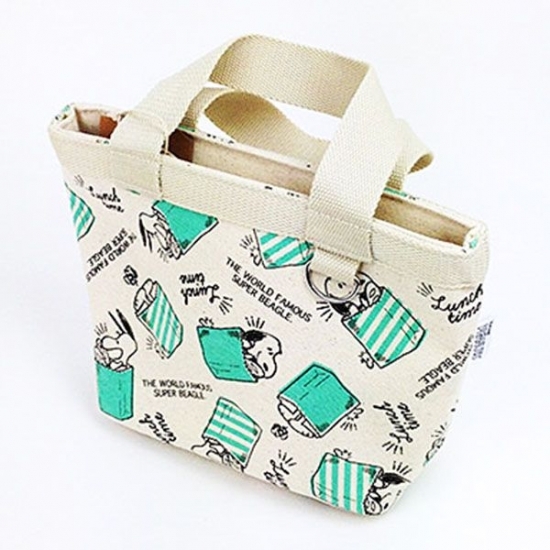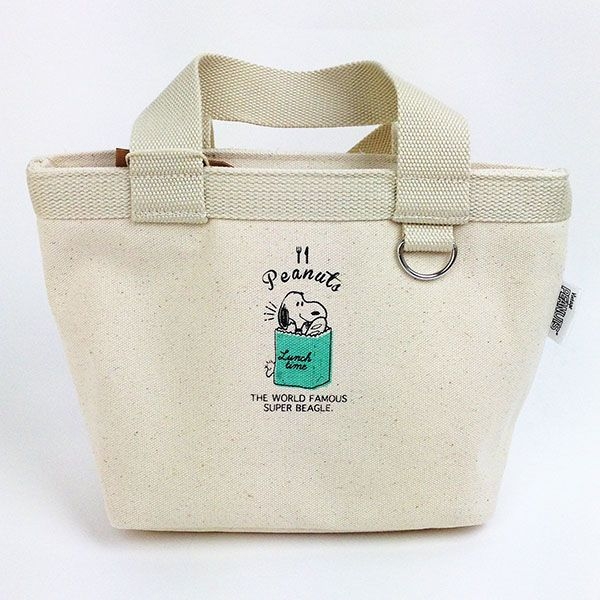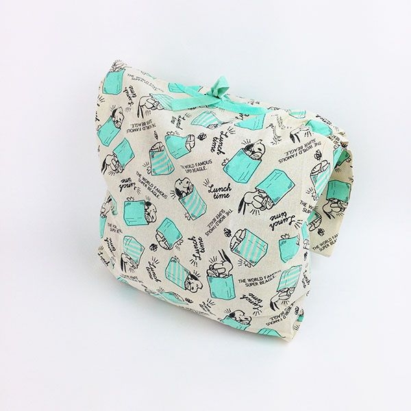 アイボリーのキャンバス地にミントカラーの紙袋に入ったスヌーピーが描かれています。逆さまになったスヌーピーまでいますね♪ウキウキしてくるような、楽しいデザインです。