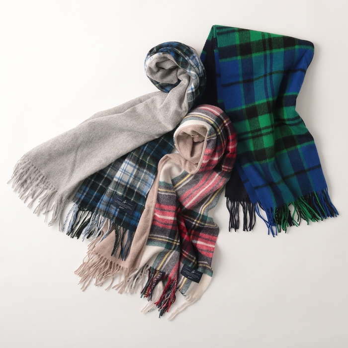 チェック柄と無地のバイカラーのデザインで、巻き方によって2通りの表情が楽しめます。ボリュームがあり暖かく軽い、使い勝手の良い大判ストールです。