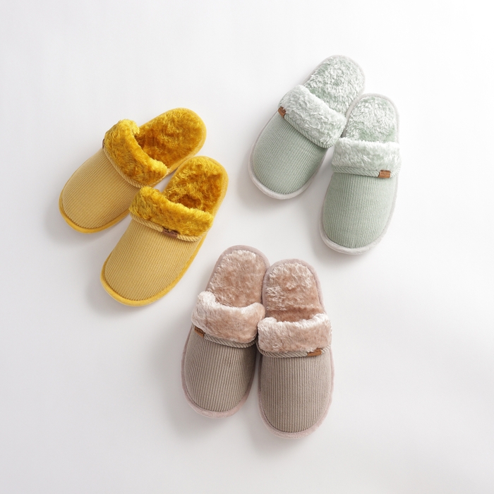 見るだけで暖かなシーズンムードを演出するリブ×ファーのスリッパ。