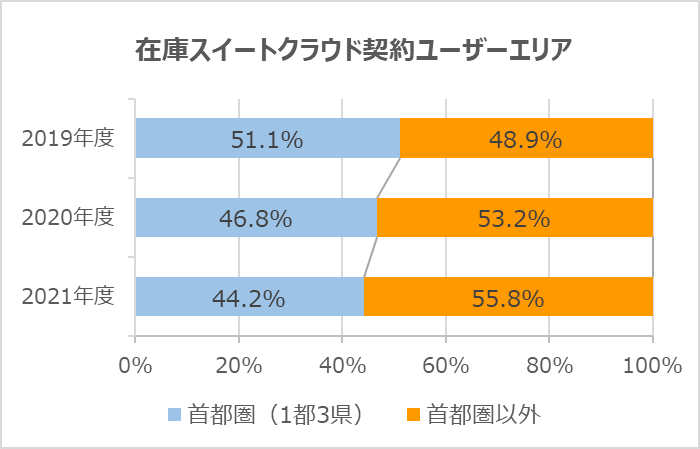 実際に、単一拠点(横浜市)の当社は主力サービスであるクラウド/SaaS在庫管理システム「在庫スイートクラウド」の契約企業において、コロナ禍でオンライン会議が急速に普及した2019年度以降、近隣エリア(首都圏1都3県)以外の契約件数が増加しています。