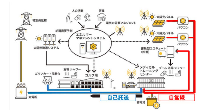 リソルの森株式会社は、横浜銀行によるサステナブルファイナンス「SDGsグリーンローン」により調達した資金を「地産地消エネルギーシステム」に充当します。1メガワットの太陽光発電設備で発電したクリーンな電力を、自営線と自己託送によりすべて「リソルの森」敷地内のスポーツ施設やゴルフ場で消費します。エネルギーマネジメントシステムによりエリア全体の需要をコントロールし、電力使用量の約30%を自家発電で賄うことでCO2排出量削減に寄与します。また、スポーツ施設やゴルフ場などの敷地内で、環境に優しいクリーンなエネルギーを可能な限り活用して、エネルギーの脱酸素化に貢献してまいります。