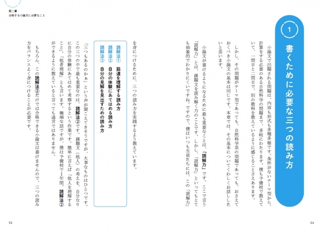 本書は、受験生が疑問に思っていることをスッキリ解決し、採点者が、おもわず読んでしまう小論文を書くコツを、とてもシンプルに、そしてわかりやすく伝えています。 キーワードは“自分の体験談”です。