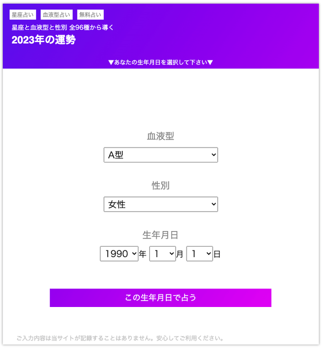 利用者は、①生年月日②血液型③性別の3点を選択することで簡単に2023年の年間運勢を占うことができます。生年月日に基づいて西洋占星術に基づいた生まれ日の太陽の位置を自動計算し、星座を導きます。加えて血液型の運勢傾向、男性女性の運勢傾向をかけあわせた計96パターンから2023年がどんな年になるのかを割り当てて結果表示します。