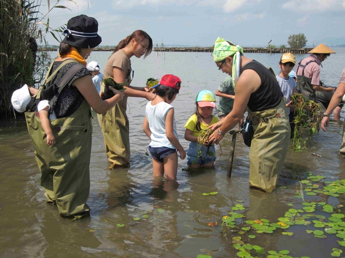 今回の活動では、午前中に、霞ヶ浦湖岸でアサザの植栽、生きもの採集と観察を行いました。アサザの植栽は水の中に入って行うため、ウェーダー(腰上まであるゴム長靴)を着用した大人はとても蒸れましたが、服のまま水に入った子供たちはとても涼しそうでした。