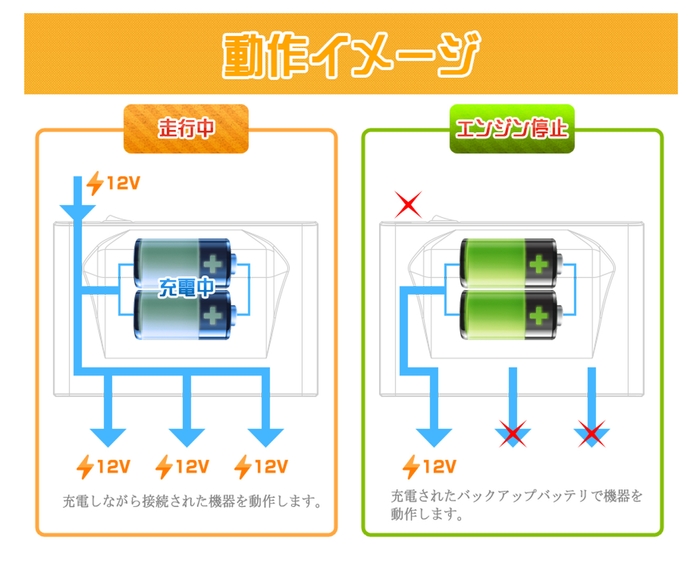 ●走行中に充電してエンジンを停止すると蓄えた電力でドライブレコーダーを安定して動かし続けます。