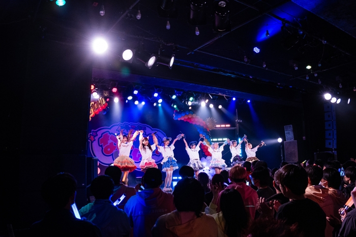 メンバーの衣装はそれぞれ動物(いぬ、くま、うさぎ、おおかみ、ひつじ、ねこ、ぱんだ)をモチーフとした、色鮮やかなお子様ウケ抜群のスタイル。ステージは老舗教育番組を彷彿させる可愛らしさ抜群のセット。ステージからの呼びかけにお客様は「はーい!」と答え、メンバーはお客さまのことを“おともだち”と呼ぶ。リーダーのひなたゆま曰く「お子様からお年寄りまで、老若男女安心して楽しめる内容のライブ作りを心掛けた」とのこと。その言葉通り、会場には若者だけでなく、子供や年齢の高いおともだちも見受けられ、全員が笑顔で心地よい空間を楽しんでいた。