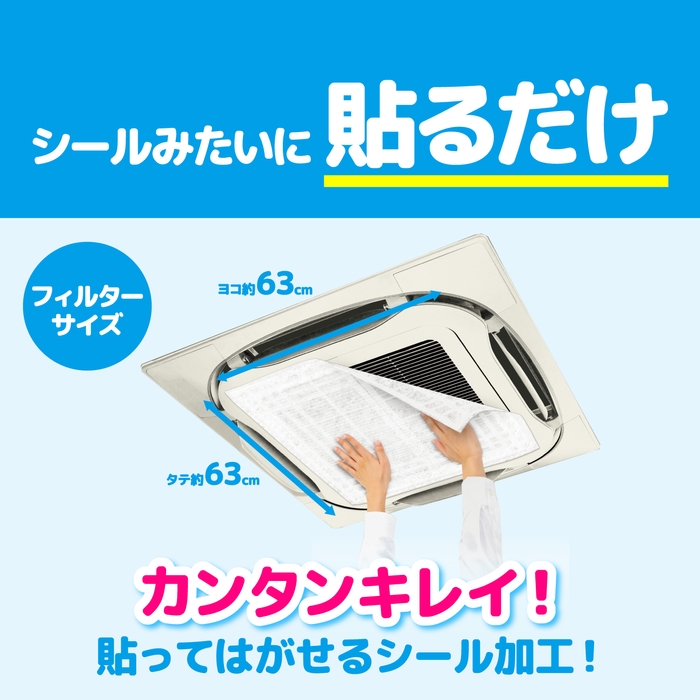天井埋込型エアコンの表面と内部に溜まるホコリや汚れをしっかりキャッチするエアコン用フィルターです。シールのように手軽に貼れるタイプなので、高所に設置されたエアコンでも取り付け取り外しがしやすく、交換時期を知らせるサイン付きで、メンテナンスが簡単です。これにより、きれいな空気を循環できます。