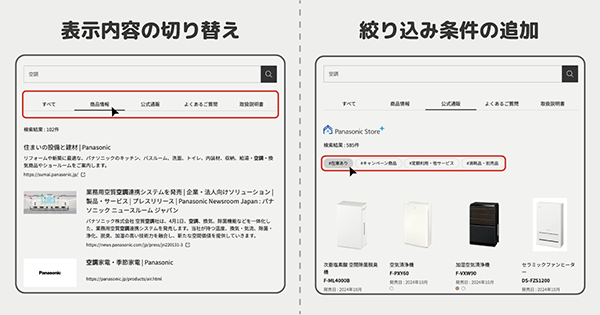 検索結果ページでは「商品情報」「公式通販」「よくあるご質問」「取扱説明書」などのタブごとに表示内容を切り替えられる機能や、商品検索結果に「#在庫あり」「#キャンペーン商品」などの絞り込み条件を追加できる機能を実装することで、ユーザーの検索の手間を削減しUX向上をサポートしています。