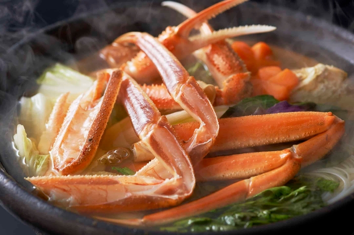 この冬の特別会席では、「山陰の冬の味覚の王様」といわれ、見た目や身入りの状態など厳しい品質管理をクリアした”タグ付き活松葉蟹”を堪能できる「活蟹としじみの蟹すき鍋」を提供します。濃厚な旨みと上品な甘みがあり、繊維が柔らかくプルプルした触感が特徴で、〆の雑炊まで松葉蟹を味わい尽くせます。出汁には宍道湖の名産「しじみ」を使用。鍋は石見地方で作られる石州瓦(せきしゅうがわら)でできた特注品を使い、器からも地域らしさを感じることができます。
