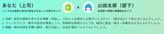 本サービスは、部下のタイプに応じたコミュニケーション方法に関するアドバイスや、1on1スキルに関するフィードバックなど、上司が1on1を進める上で必要な支援を行い、スキル向上に貢献します。主な特長は以下の通りです。