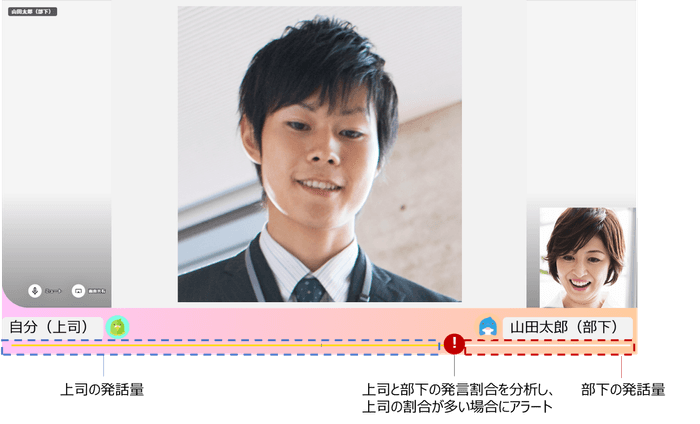 本サービスでは、1on1実施中の上司と部下の発話量を、上司に対してリアルタイムに可視化するしゃべりすぎ防止アラート機能(※4)を提供します。上司の発話量が部下よりも多い場合はアラートを出すことで、部下が話したいことをしっかり話せる1on1の実現を支援します。積極的な発話を促し部下自身が多くの気づきを得ることで、ワークエンゲージメントの向上や自律的な成長などに繋がるよう支援します。