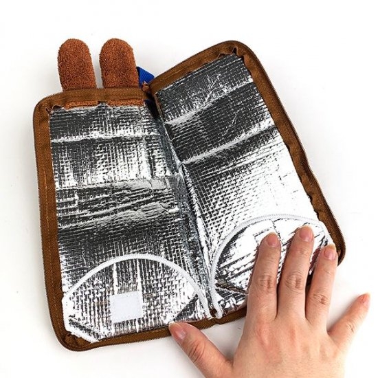 表側はタオル地になっていて、一見するとハンカチかのようなアイテム。中身がアルミ素材になっていて、ペットボトルなどの保冷や保温に最適なんです。しかも、結露防止にもなるので、カバーをつけたままバッグに入れても安心。