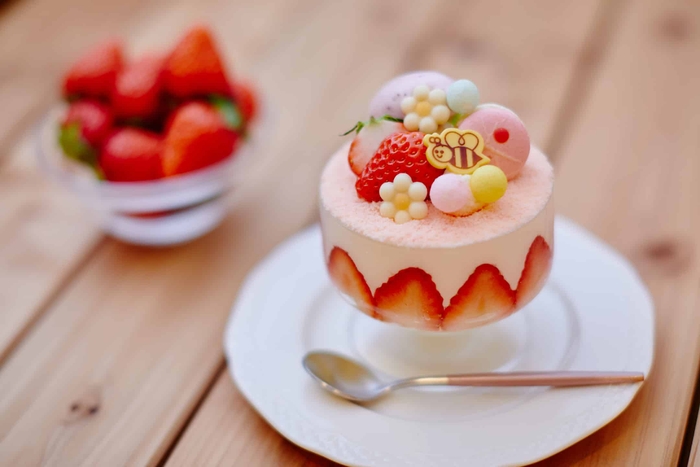 ピクニックをコンセプトにした空間で、スタッフから手順やクリームの絞り方などの簡単なレクチャーを受けたら、早速スイーツづくり開始です。子どもたちがつくるのは、「ストロベリーパフェ」。いちごをグラスに並べたら、練乳クリームを絞ります。花やハチのチョコレート、マカロンをトッピングしたら、最後にいちごをのせて完成です。いちごをふんだんに使った見た目にもかわいらしいスイーツです。