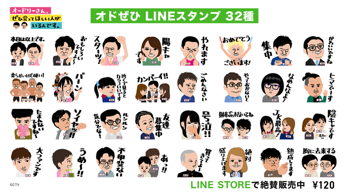 とは言うものの、LINEスタンプといえばかわいいキャラクターや有名人をイラストにしたりと、ポップなものが主流。しかしオドぜひは、ポップさとは真逆の「地上波の果て」と言われる番組。主役は「ぜひらー」と言われる一般素人。選択の余地はない!オドぜひのLINEスタンプは、オードリー・アシスタントの阿部芳美アナ(中京テレビ)以外は一般素人を起用しちゃえ!番組ロゴの中にも描かれたオードリーのイラストのタッチで全32種類を取り揃え、番組公式ではありえない、知名度ゼロの一般人がLINEスタンプになりました。