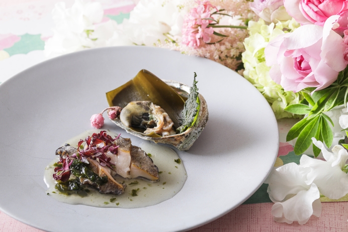 鮑の上に、桜の葉・青森県産昆布をのせ、桜香る岩塩で包み柔らかく蒸しあげます。