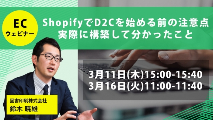 図書印刷株式会社は、D2Cに関心をお持ちのマーケティング・経営企画のご担当者様を対象とした無料オンラインセミナー『ShopifyでD2Cを始める前の注意点 実際に構築して分かったこと』を、来る3月11日(木)、3月16日(火)に開催いたします。