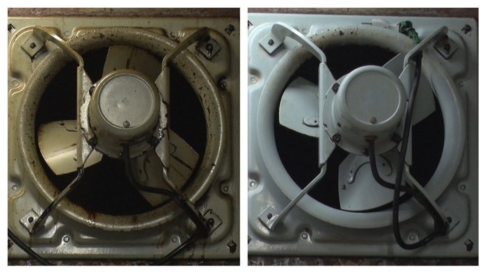 藤本さんたちがきれいにするのは、旦那さんとの思い出が詰まった厨房。油汚れが蓄積した換気扇、レンジフード、調理台、元々の色がわからなくなるほど汚れた蛇口、黒く変色したコンクリートの床です。