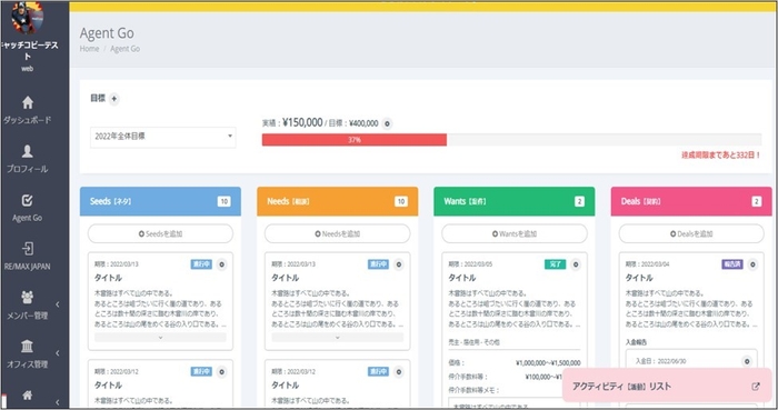 所属オフィスからの業務サポートはありますが、各エージェントがセルフマネージメントをしながら活動していくことが成功へのカギとなることから、日々の取り組みから契約・決済までをオリジナルで自己管理でき、成長と成約を促す「AGENT GO」の開発に至りました。