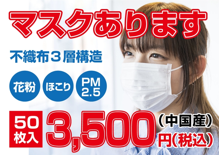 ちゃ~り~マスク 不織布3層マスクを1箱(50枚入り) 3,500円 (税込・配達料込)で販売中