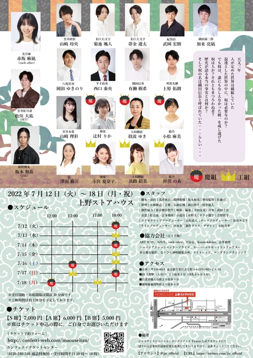 ジャスティスジャパンエンターテイメント(東京都港区、代表:松島 みどり)主催、戦国絵巻~からす瓜~一の巻『魔王生誕』が2022年7月12日 (火) ~2022年7月18日 (月・祝)に上野ストアハウス(東京都台東区)にて上演されます。チケットはカンフェティ(運営:ロングランプランニング株式会社、東京都新宿区、代表取締役:榑松 大剛)にて6月1日(水)12:00より発売開始です。