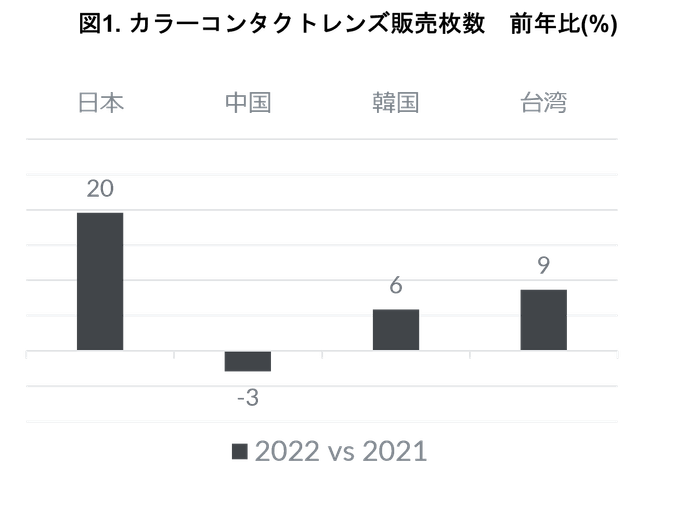 ・2022年のカラーコンタクトレンズ市場は、日本、韓国、台湾で前年を上回った。