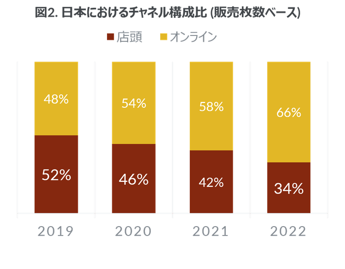 日本のチャネル動向を見てみると、オンラインが販売を市場を牽引している状況にある。販売チャネル構成比は、2019年に店頭とオンラインがほぼ同率であった。しかし店頭販売は減少が続き、オンラインが増加を続けたことで、2022年にオンラインが70%近くとなり、約20ポイントも拡大した。中国でもオンラインの好調さが目立ち、店頭での購入は縮小が進んでいる。
