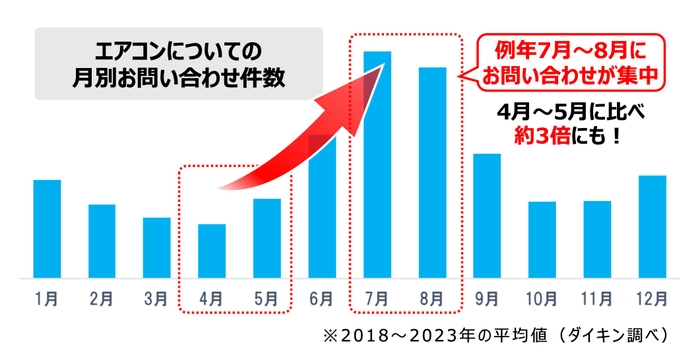 例年、エアコンのお問い合わせや点検のご依頼は、エアコンを使い始める6月頃から増え始め、7月、8月 に集中します。混雑により暑い時期に修理対応をお待ちいただく場合があるため、本格的に暑くなる前の4月~6月前半に試運転を行い、早めに準備を済ませていただくことをご提案しています。