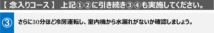 エアコンは冷房運転時、室内機の中にある熱交換器が冷やされて結露水が発生します。発生した結露水はドレン配管とよばれるホースで屋外に排水されます。30分程度の冷房運転で結露水を十分に発生させ、屋外のドレン配管から水が出てくるところまで確認できれば安心です。