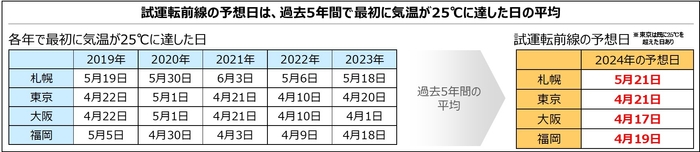 こうした考え方で各地の予想日を見ていくと、今年の試運転前線は、4月上旬に那覇に上陸し、4月中旬には九州・中四国から太平洋沿岸地域へ、その後本州を北上し、5月後半に札幌へ到達する予想です。現在、地域によっては既に25℃以上の日もあり、早めの試運転をおすすめします。