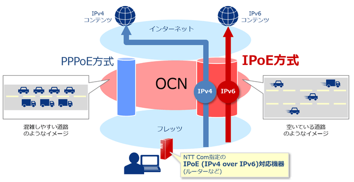 このためNTT Comは、より快適にインターネットをご利用いただけるよう、「OCN」のお客さまにIPoE接続を標準提供することで、ネットワークの混雑を緩和し、通信品質の向上を図ります。 - IPoE (IPv4 over IPv6)とは