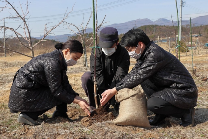 軽井沢星野エリアの日帰り温泉施設「星野温泉 トンボの湯(以下、トンボの湯)」は、地元農家と協同し、りんご湯で使用したりんごを堆肥(*)へと再資源化する取り組みを昨年より開始しました。この度、りんごを主原料とした堆肥「りんご土」が完成しました。先日3月19日に、トンボの湯のスタッフが農家を訪ね、りんご畑の苗木にその土を還元しました。4月26日より近隣住民の方にもその一部を無料で配布します。