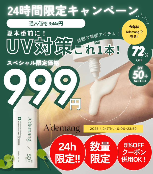 株式会社LIVOは韓国の大人気スキンケアブランドA'demang、SPF50+PA+++CICAサンクリーム通常価格3,447円をQoo10 LIVO SHOPにて24時間限定・数量限定・スペシャル限定価格999円で販売いたします。また、Qoo10 LIVO SHOP内で使える5%OFFクーポンも併用可能で、よりお得に購入できます。