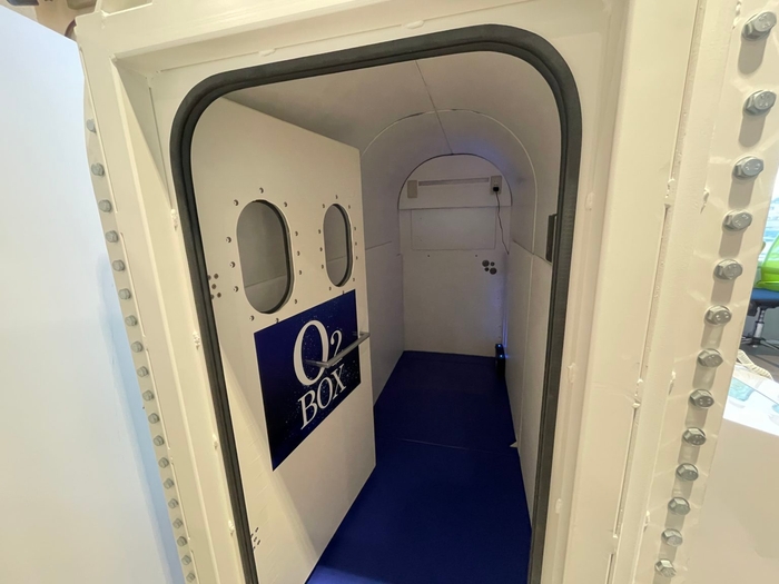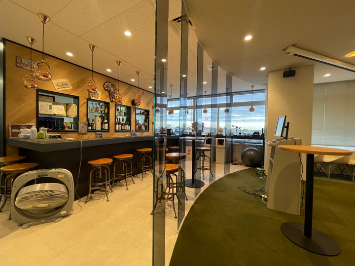 エントランス裏手にはサークル上の段々になったフリーススペースがあり、窓際にはバーカウンター、酸素カプセルまであるという遊び心溢れるスペースです。