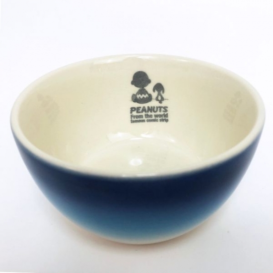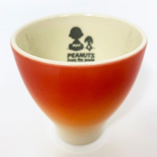 まずは、夕焼けのようなオレンジ色のグラデーションが美しいボウルをご紹介。アイボリーのボウルで、外側がグラデーション、内側にチャーリーブラウンとスヌーピーの後ろ姿のシルエットがデザインされています!