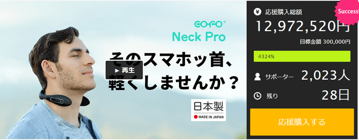 「COFO Neck Pro」は2020年10月7日よりMakuakeでのプロジェクト始動となりました。目標値であった30万円を開始30分で達成し、1ヶ月後に活動サポーター数「2000名様」を超える等、多くの注目を獲得しています。YouTube動画による専門家の紹介なども行われ、引き続いて更なる記録の達成が大いに期待されている所です。