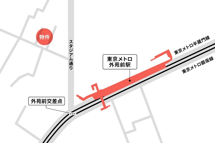 東京メトロ銀座線 外苑前駅から徒歩2分に位置する土地を投資対象としています。本物件は角地であり、2つの通りに面する視認性の良さを活かして、商業店舗ビルの開発を行います。