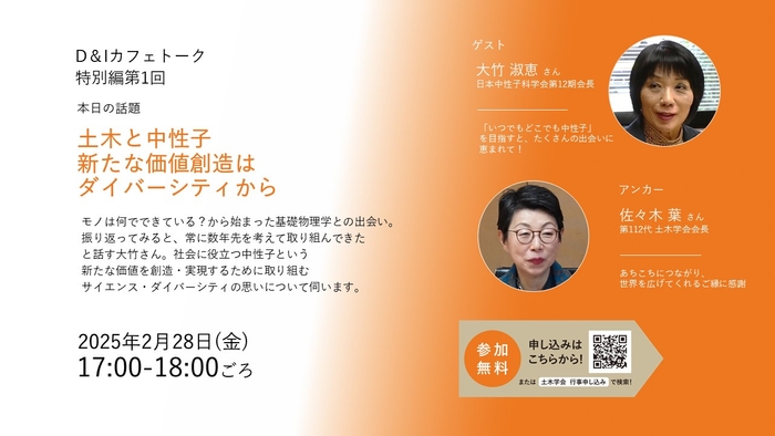 公益社団法人土木学会(会長 佐々木葉)は、佐々木葉 第112代土木学会会長と大竹淑恵第12期日本中性子科学会会長の対談を、D&Iカフェトーク特別編第1回「土木と中性子 新たな価値創造はダイバーシティから」として2月28日(金)にオンライン配信します。