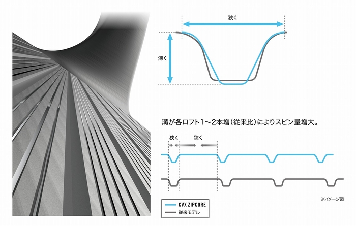 溝の設計をより深く、より鋭く、ピッチを狭くし、本数を増やすことでフェアウエイやラフなどのウエット条件でも安定したスピン性能を発揮します。