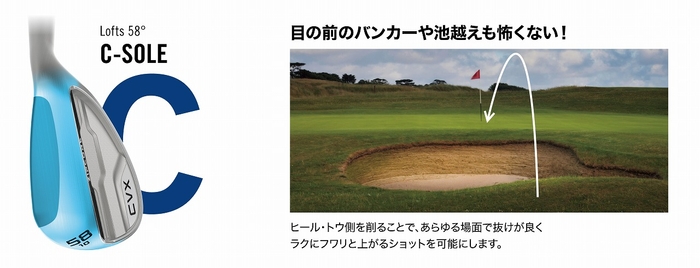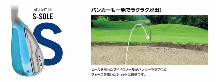 ロフト別に最適な3種のソール形状をほどこすことで、ショートゲームの様々なシーンをやさしくし、気持ちよく楽なアプローチショットを実現します。
