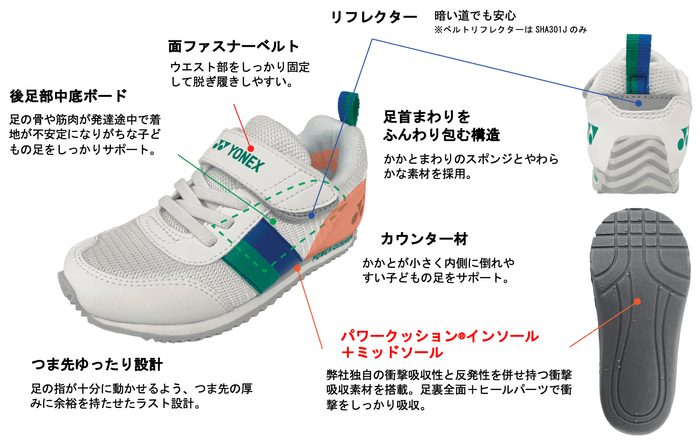 弊社独自の衝撃吸収反発素材「パワークッション®」を搭載。年齢や足の成長に合わせた構造や素材、設計を採用し、子どもにやさしい工夫を各所に施しました。